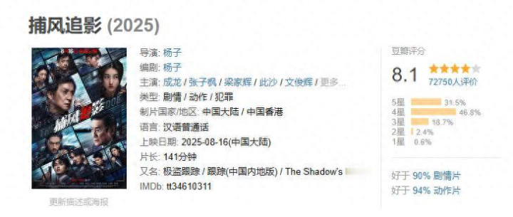尤其当AI失效,成龙饰演的退休追踪群众黄德忠只可靠一对肉眼和两条腿去追影时,剧情忽然有了温度——科技越冰冷,东说念主性越滚热。