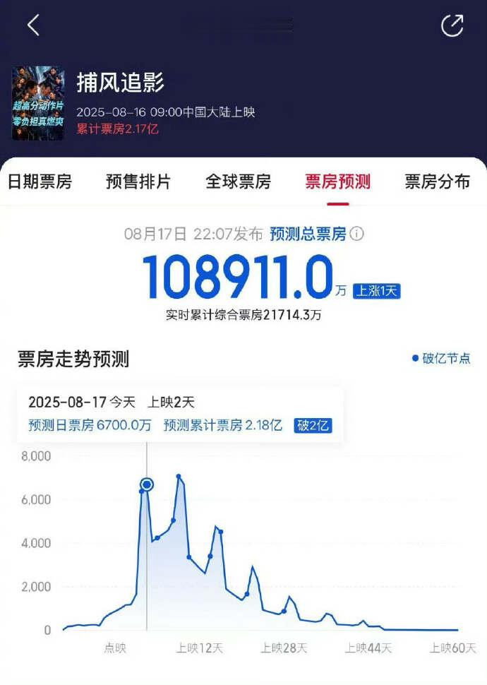 收尾8月18日,据猫眼专科版数据潜入,电影《捕风追影》展望票房高潮!展望总票房超10亿。