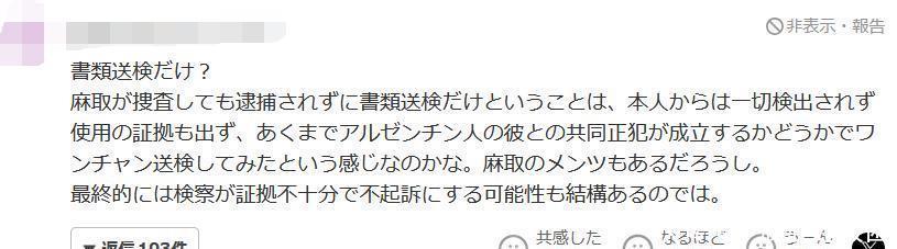 只是是送检吗?麻药取缔部明明也曾开展搜查,最终却没本质逮捕,只走了送检进程。这会不会是因为从她本东说念主身上完全没检测出毒品要素,也莫得任何吸毒的字据,是以警方姑且试着送检,望望能含糊定她与那名阿根廷男人组成共同违章呢?毕竟麻药取缔部也要顾及自己面子。最终,检验机关很有可能会以字据不及为由,作出不告状的决定。
