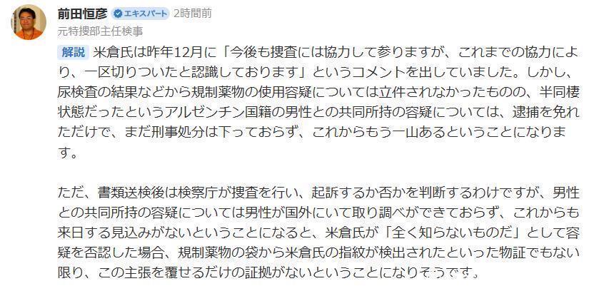 米仓女士已于旧年12月发表指摘称:“我会不绝互助后续探望,但就目下已完成的互助责任而言,我认为关系进程已告一段落。”不外,尽管尿检着力自大,针对她的不断药物使用嫌疑未予立案;但关于她与处于半同居状况的阿根廷籍男性共同握有不断药物的嫌疑,她只是是免于逮捕,关系刑事刑事职守目下仍未下达,后续显明还会有新一轮的探望轮番。需要讲解的是,案件送检后,将由检验厅接办开展探望,并判断是否对其拿起公诉。但就共同握有这一嫌疑来看,由于涉案男性身处境外,关系审讯责任无法开展,且今后也暂无其翌日的可能。这种情况下,若米仓女士以 “对此事完全不知情” 为由含糊嫌疑,那么除非能从不断药物的包装袋上检测出她的指纹这类物证,不然检验机关就怕难以找到足以推翻其方针的字据。