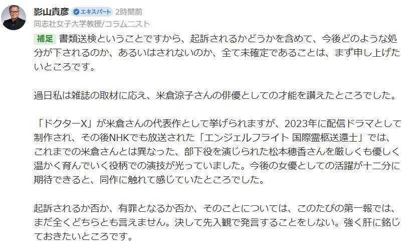 12月,米仓凉子通过其所属事务所官网发布声明,实质如下:正如部分媒体报说念,司法机关确曾对我住所进行搜查,此为事实。