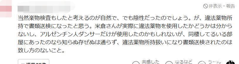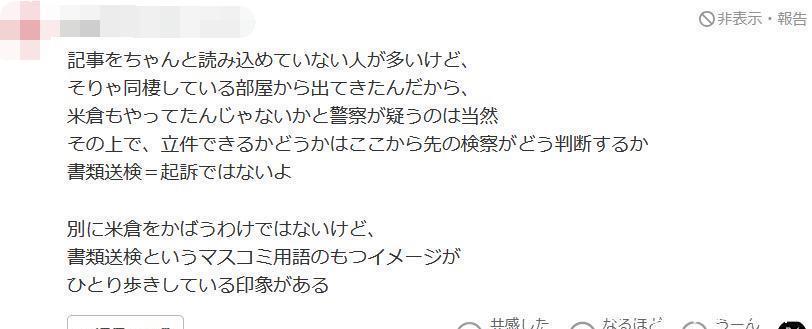 嗅觉许多东说念主齐没追究看新闻报说念。既然犯禁药物是从她同居的房间里搜出来的,警方怀疑米仓也参与其中,这天然是循规蹈矩的。但话说转头,能不可安稳立案,就要看接下来检验机关如何判断了。送检≠告状啊。我倒不是要故意偏私米仓,只是以为 “送检” 这个媒体常用术语,也曾被全球污蔑出了和本意不符的印象,有点偏离它本来的含义了。