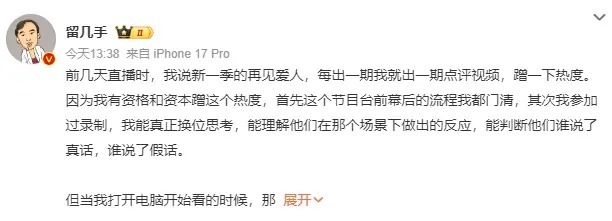 10月16日,曾参与《重逢爱东说念主4》的嘉宾留几手在酬酢媒体发文,称将不再更新《重逢爱东说念主》新一季的点评视频。他暗示,由于我方曾切身参与节目次制,在总结节目内容时,被横暴的心理回忆所敛迹,难以看守客不雅安定的辩论气魄。