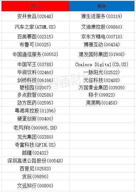 同期剔除雅生计办事(03319)、京东方精电(00710)、建发外洋集团(01908)、ChainceDigital(CD.US)等11只个股。