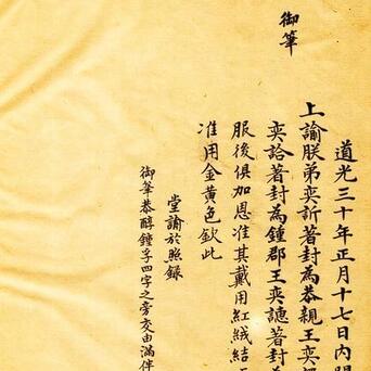 这是谈光天子驾崩后第三天,刚即位的咸丰天子对弟弟们进行晋封。六弟奕訢著封为恭亲王,七弟奕譞著封为醇郡王,八弟奕詥封为钟郡王,九弟奕譓封为孚郡王。