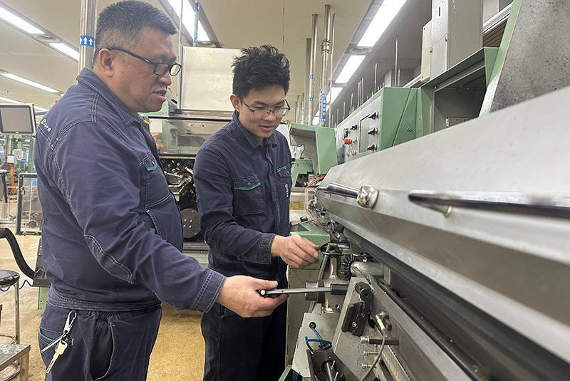 维修师陈远明(左)给操作工西宾凭准盘诊疗要点。贺梓轩摄